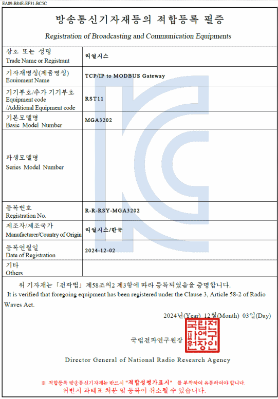 전자파 인증 번호: R-R-RSY-MGA3202 (2024.12.2 등록)